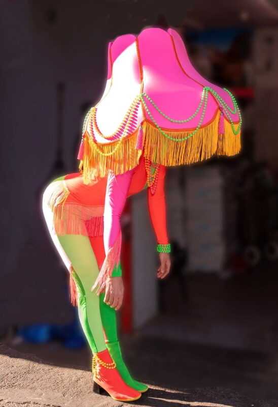 colourful lampshade costume cabaret dancer for hire London and Brighton